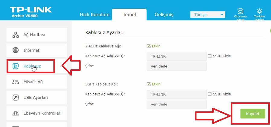 Ayarları yaptıktan sonra sayfanın yine sol tarafında yer almakta olan ”Kablosuz” butonuna tıklıyoruz.