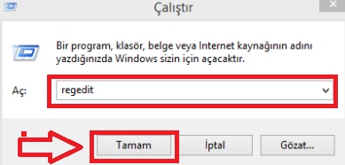 - ”Çalıştır” yazıp daha sonrasında gelecek olan ekran bilgilendirmesine ”Regedit” yazarak alt kısımda ”Tamam” diyerek işlemlerimize devam ediyoruz.