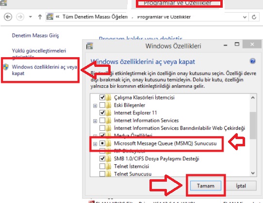- Ekranın orta kısmında yer alan özellikleri içerisinde ”Microsoft Message Queue (MSMQ) Sunucusu” alanına bulup sol tarafındaki kutucuğu işaretledikten sonra ”Tamam” dedikten sonra,