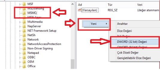 - ”Varsayılan” uzantısının üzerine geldikten sonra sağ tıklayıp ”Yeni” dedikten sonra DWORD(32 bit) değerine tıklıyoruz.