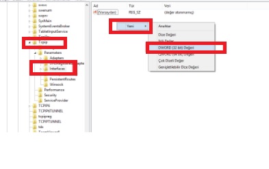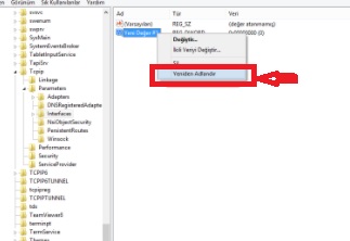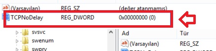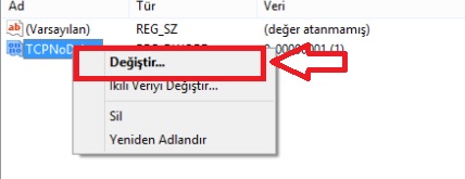 TCPNoDelay ile ilgili yazının üzerine gelip sağ tıklayıp ”Değiştir” alanına tıklıyoruz.